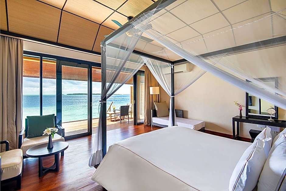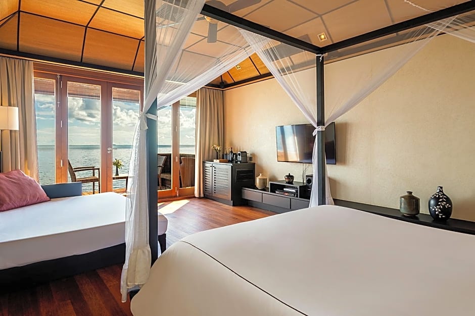 Largest Villa features a glass bottom floor offering views of the lagoon, 23 ft² spa pool, and private deck with direct access to the lagoon. Villa includes air-conditioning, a flat-screen satellite TV and home theater system. Tea/coffee making facilities, safe and mini-bar are included. An indoor bathroom comes with a spa bathtub and shower. Inclusions: - Breakfast, Lunch & Dinner at Lily Maa - 1 free A La Carte Dining Experience at Tamarind per stay - Optional Lunch at Aqua fine dining - Unlimited soft & alcoholic beverages from any outlet in the resort - 3 excursions per person per stay to choose from 4 - Free non-motorized watersports - Free mini-bar daily refill - Free use tobacco - Zumba/yoga/gym & tennis court facilities with equipment - Weekly Dj Night Access - Lily seaplane lounge access - 80 types of wine from all over the world to taste from